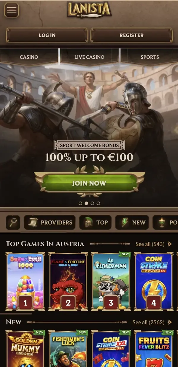 Αν έχεις ήδη λογαριασμό, το Lanista login στο κινητό χρησιμοποιεί το ίδιο email και κωδικό πρόσβασης όπως στο desktop. Για παίκτες που προτιμούν μια απλή προβολή lobby, το Lanista mobile κρατά τα βασικά κουμπιά (παιχνίδια, ταμείο, προσφορές, υποστήριξη) εύκολα προσβάσιμα. Μπορείς επίσης να φιλτράρεις γρήγορα για να βρεις κουλοχέρηδες Lanista ανά πάροχο ή θέμα, ανάλογα με το τι θέλεις να παίξεις.